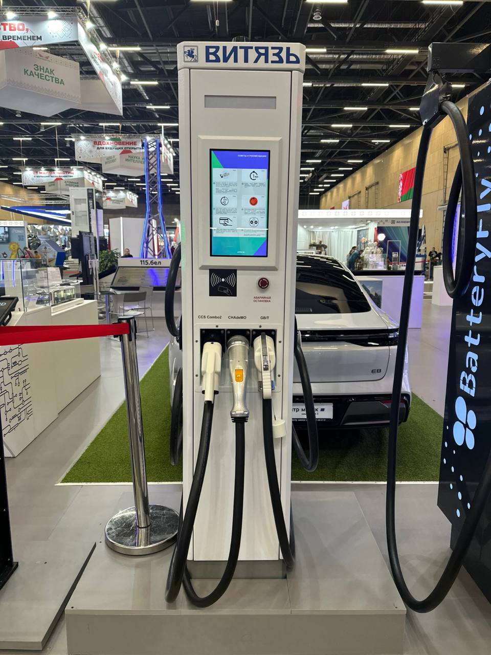 Так, ОАО «Витязь» презентуется стационарная электрозарядная станция ЕС-401-15, предназначенная для зарядки электромобилей постоянным током в режиме Mode 4, оснащенных разъемами ССS Combo 2 или CHAdeMO. Устанавливается данная станция на стоянках, парковках.